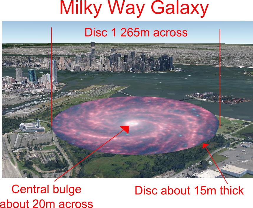 The Milky Way Galaxy is actually larger than most galaxies. In our Penny System it would be a flat disc about the size of a city park, 1265 meters across, 15 meters thick and with a central bulge about 20 meters across.