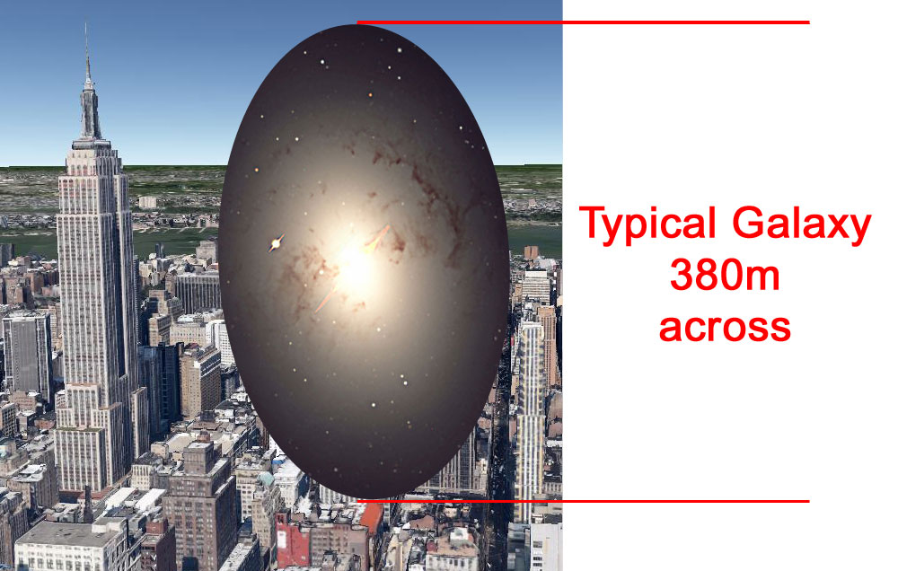 A typical galaxy would be about the size of the Empire State Building in New York, about 380 metres across.