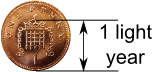 A light year (the distance light would travel in a year) would be just over half the size of the penny.