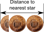 Looking at things larger than the penny Solar System, the nearest star would be about two and a half pennies away.