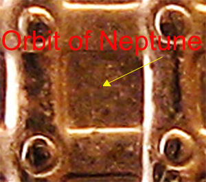In fact, the diagram above actually exagerates the size of the planetary region to a significant degree! To show the size more accurately, let's zoom into the centre of the penny and look at the orbit of the outermost planet: Neptune. It's represented on the diagram by a red dot.